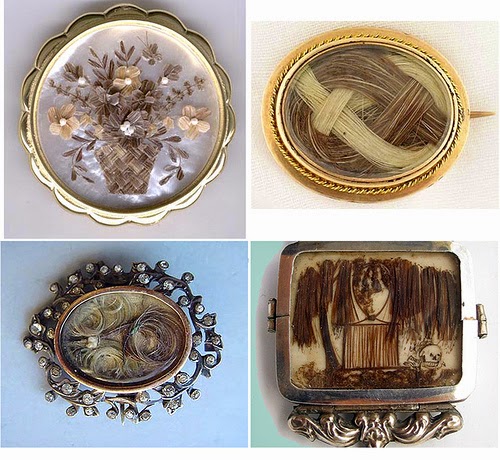 A stunning 18K hair locket mourning brooch in intricate lace of seed pearls - from the Georgian era, c. 1790- 1830, set with the locket center that holds a plaited lock of the hair of someone well loved, long mourned, who died over 170 years ago. Those below are more lockets containing hair from a dearly departed.